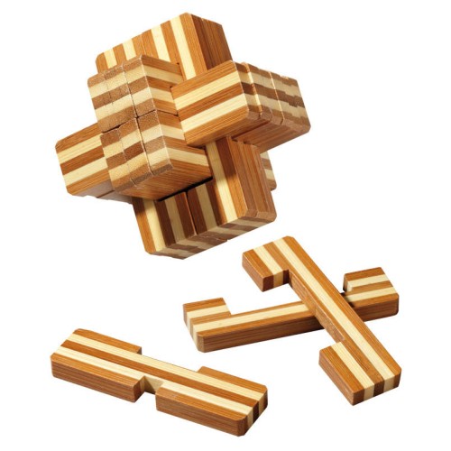 Alleen met veel handigheid en goed nadenken lukt het om deze puzzel uit elkaar te halen en weer in elkaar te zetten.